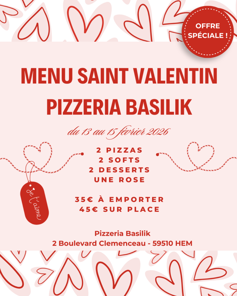 Pour la Saint-Valentin, Basilik vous invite à partager un moment gourmand et complice autour d’un dîner en tête-à-tête. Du 13 au 15 février 2026, laissez-vous séduire par une formule pensée pour les amoureux : deux pizzas savoureuses, deux softs, deux desserts gourmands, le tout accompagné d’une rose offerte pour marquer l’occasion.