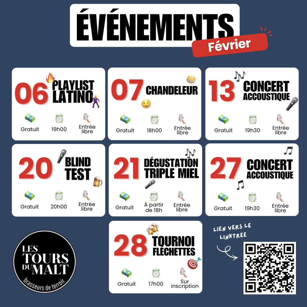 Aux Tours de Malt, on ne se contente pas de brasser de la bière : On anime la ville toute l’année avec des concerts, des soirées, des blind tests et plein de bons moments